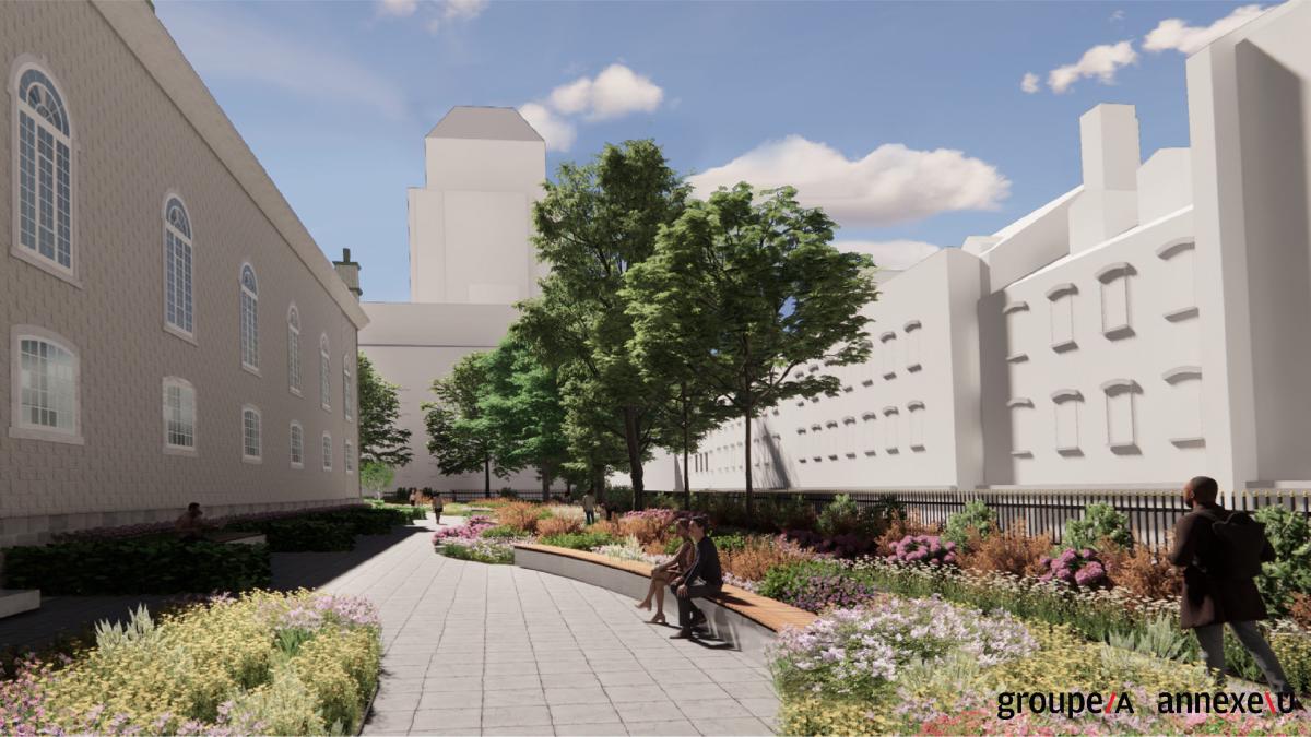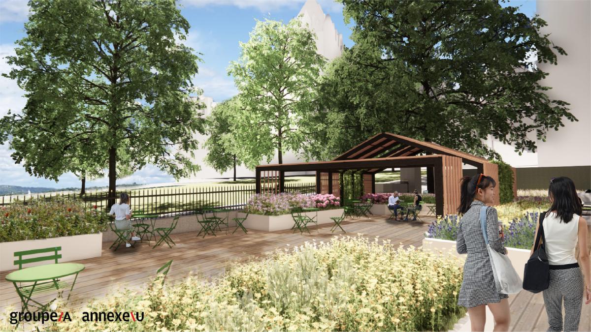 Open area with urban furniture allowing the holding of various activities. Secondary path laid out in shrubs and bushes, along Rue Sainte-Anne.
